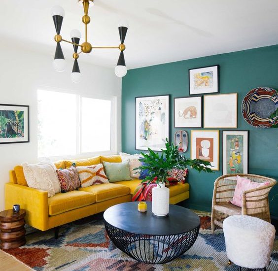 O escritório na sala na sala de tv pode ser uma boa ideia, basta uma mesa simples e pronto. Seu escritório vai fazer parte da decoração. Invista em um ponto de cor nos ambientes mais neutros, como no exemplo abaixo em que todos os móveis possuem cores neutras, mas a cadeira amarela deu o destaque necessário.